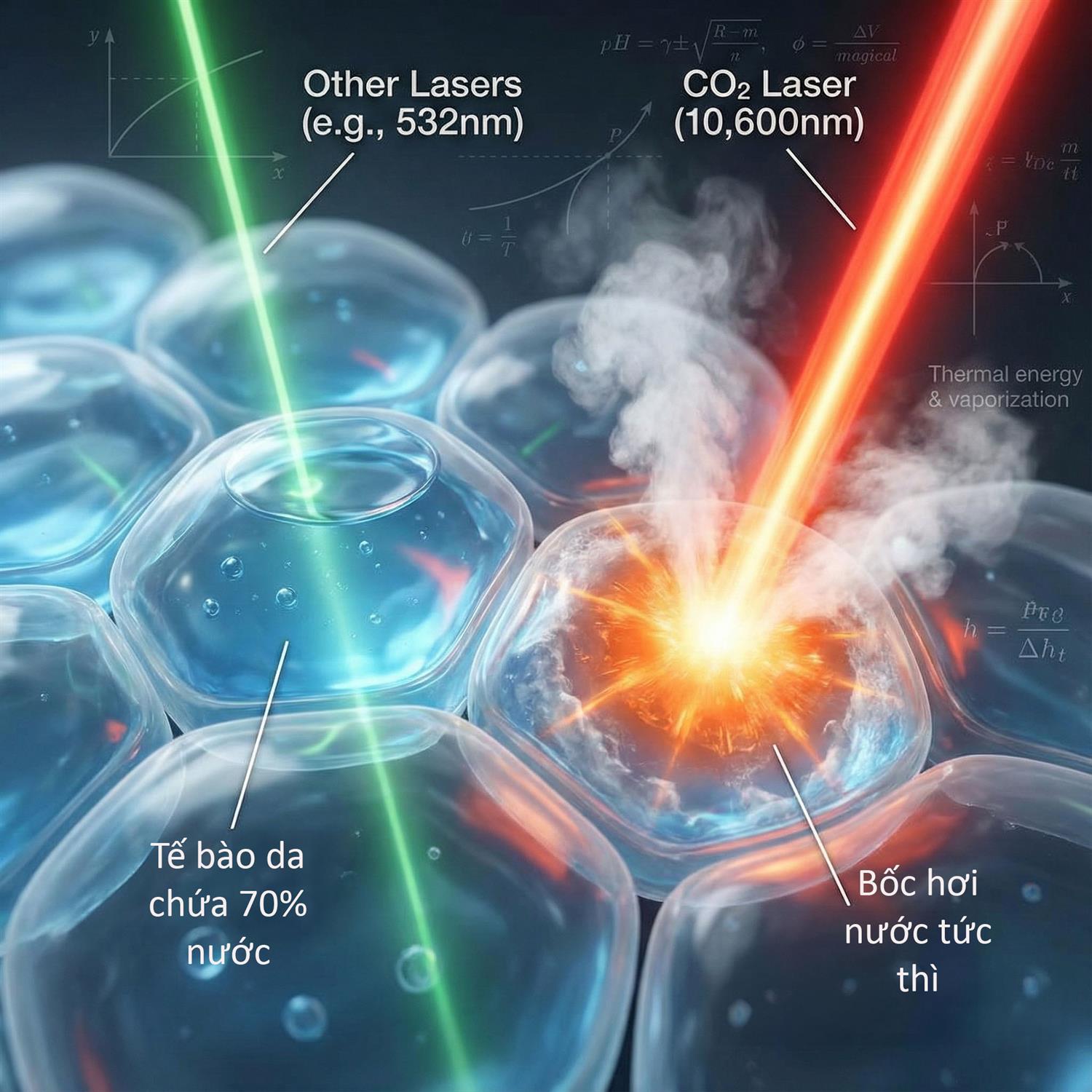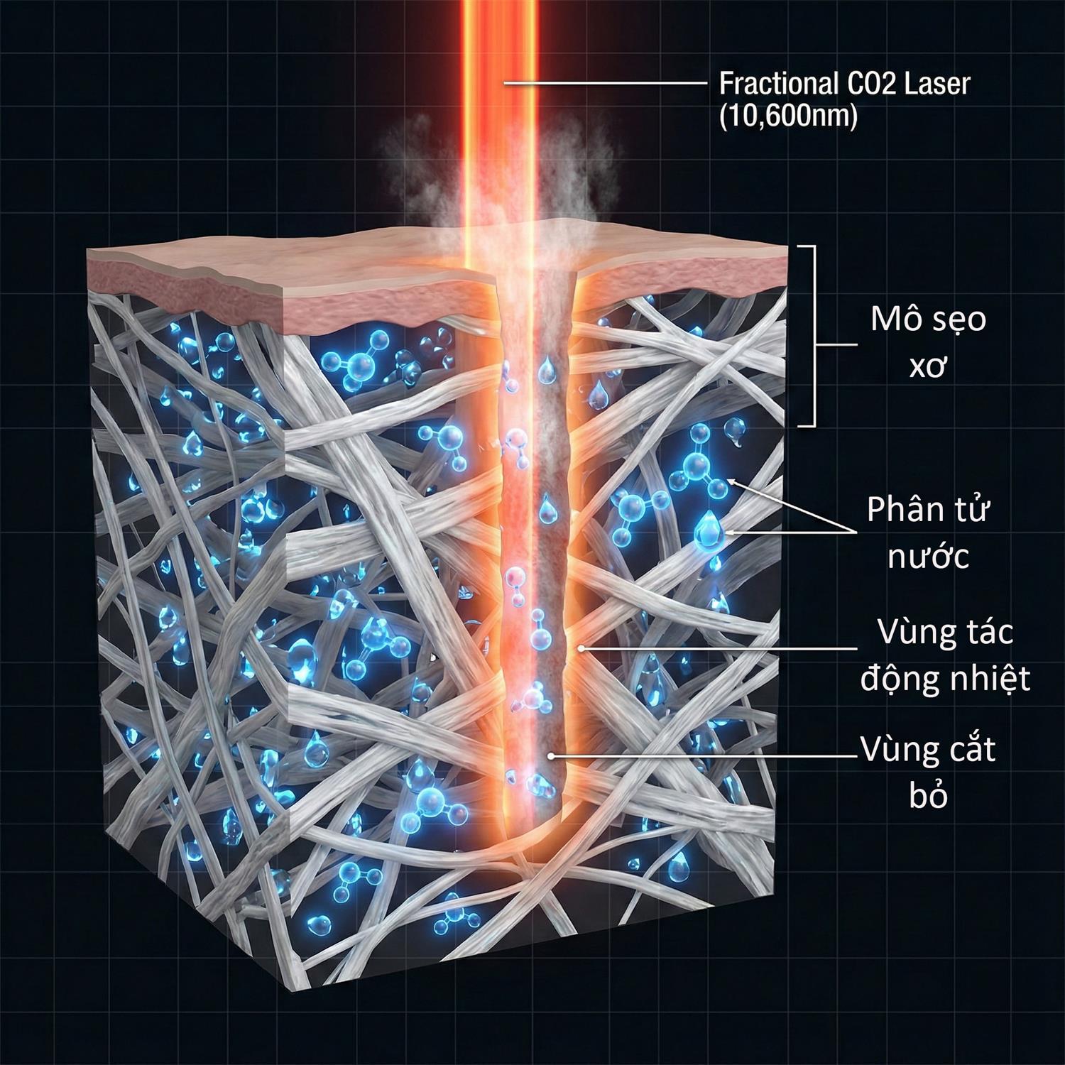 Vì cơ thể người chứa 70% là nước, nên khi tia Laser CO2 chiếu vào da, nó sẽ ngay lập tức làm bốc hơi nước trong mô, tạo ra nhiệt lượng cực lớn để cắt đốt và phá hủy các mô xơ sẹo cứng đầu. Đây là điều mà các loại laser khác hay mỹ phẩm bôi thoa không thể làm được.