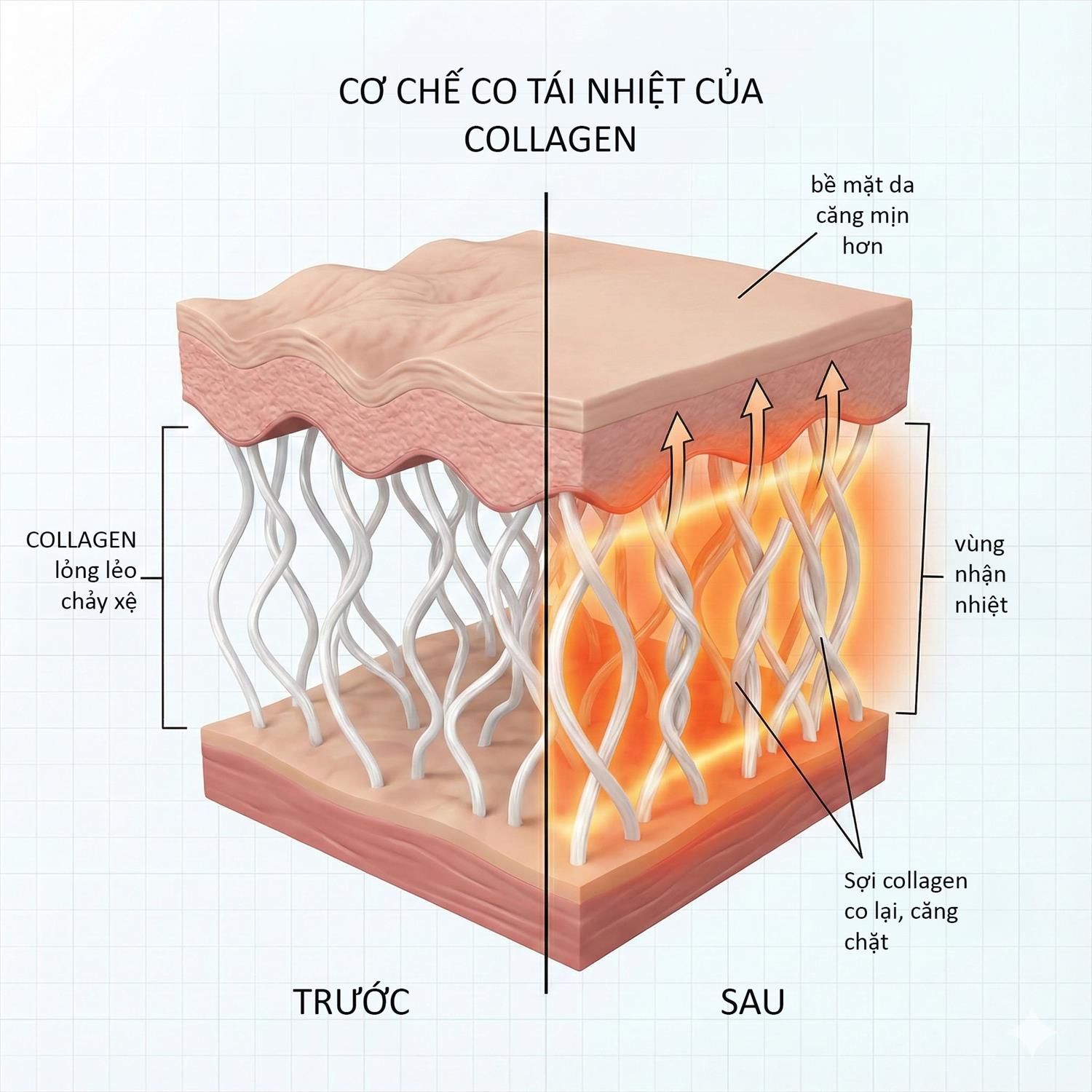 Tác động nhiệt (Thermal Damage) làm co rút các sợi collagen chùng nhão ngay lập tức. Sau khi bong vảy (5-7 ngày), lớp da non mới hình thành sẽ phẳng mịn, lỗ chân lông được thu nhỏ đáng kể do cấu trúc da săn chắc hơn.